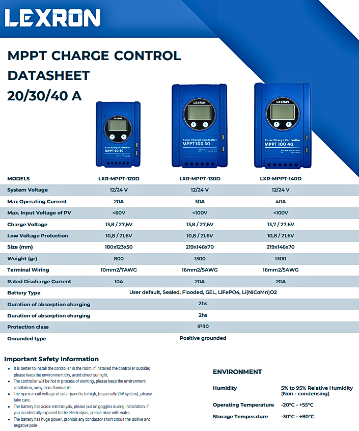 Lexron LXR-MPPT-120D, güneş enerjisi sistemleri için özel olarak geliştirilmiş, yüksek performanslı ve akıllı bir MPPT (Maksimum Güç Noktası Takibi) şarj kontrol cihazıdır. Gelişmiş algoritmalarla çalışan bu cihaz, güneş panelinden alınan enerjiyi en verimli şekilde akülere aktararak sistem performansını artırır.